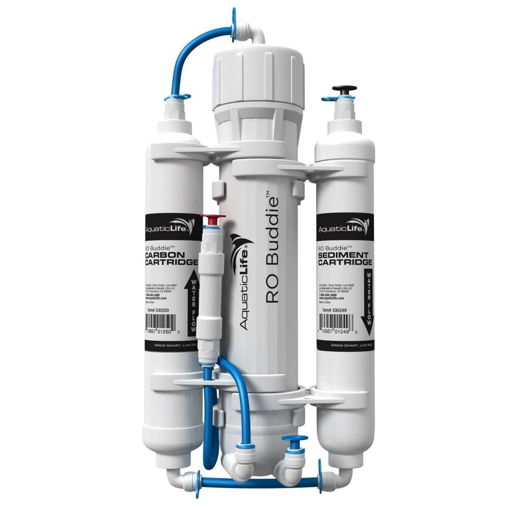 The Aquatic Life RO Buddie 50 GPD 3-Stage RO system features unbelievable affordability and functionality, all in a very compact design. Designed to provide a reliable source of economical filtered water for aquarium use, all systems use Thin-Film Composite (TFC) Membrane RO cartridges in conjunction with Carbon and Sediment cartridges to effectively and efficiently remove harmful substances such as heavy metal ions, dissolved solids (TDS), Chlorine and particulate matter from municipal tap water.