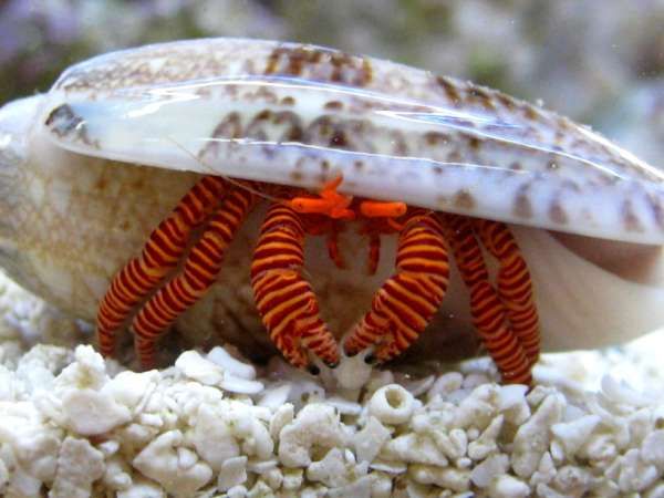 Adding further value, the Halloween Hermit Crab is known to efficiently eat algae including green hair algae and cyanobacteria. It also provides a valuable service of aerating aquarium substrate by sifting through the sand. Be aware that as the Halloween Hermit Crab attains a large size, this lumbering scavenger may disrupt rockwork or corals in reef aquariums. The Halloween Hermit Crab lives in abandoned snail or triton shells and may resort to attacking and eating a snail so it can use the shell for its home. To prevent this from happening, provide the Halloween Hermit Crab empty shells of assorted shapes and size.