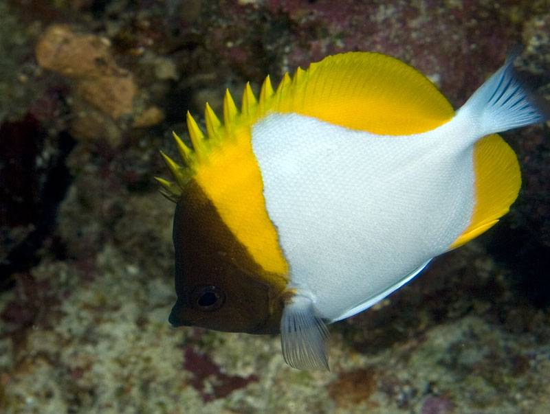 The Yellow Pyramid Butterflyfish is also known as the Yellow Zoster Butterflyfish, and occurs in large numbers among the reefs of the Indian Ocean. The fins are yellow in color, and the body is mostly white. The white coloration forms a triangle with the yellow fins, lending it its common name. The head area is black helping these fish camouflage themselves in the wild. The Pyramid Butterfly feeds upon plankton in the wild, and is safe for reef aquariums.